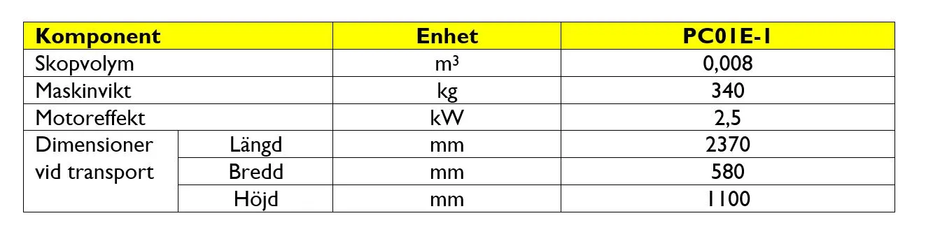 Komatsu och Honda har tillsammans utvecklat PC01E-1 genom att integrera Hondas ”Mobile Power Pack e: och Honda eGX el-drivenhet. Som ett resultat av elektrifieringen bidrar PC01E-1-modellen till minskat buller. Den är miljövänlig och bekväm att arbeta med, både i inom- och utomhusmiljöer, eftersom det inte bildas några avgaser. Batterierna är utbytbara så användaren kan fortsätta att arbeta genom att enkelt byta batterierna. Den nya elmotorn ger hög prestanda, även vid låga varvtal, vilket innebär att man gräver mer med PC01E-1-modellen än med den konventionella modellen. Då det inte finns någon dieselmotor installerad behöver användaren inte längre utföra motorrelaterat underhåll eller bränslepåfyllning, vilket avsevärt minskar dagliga inspektioner, underhållsarbete och kostnader.