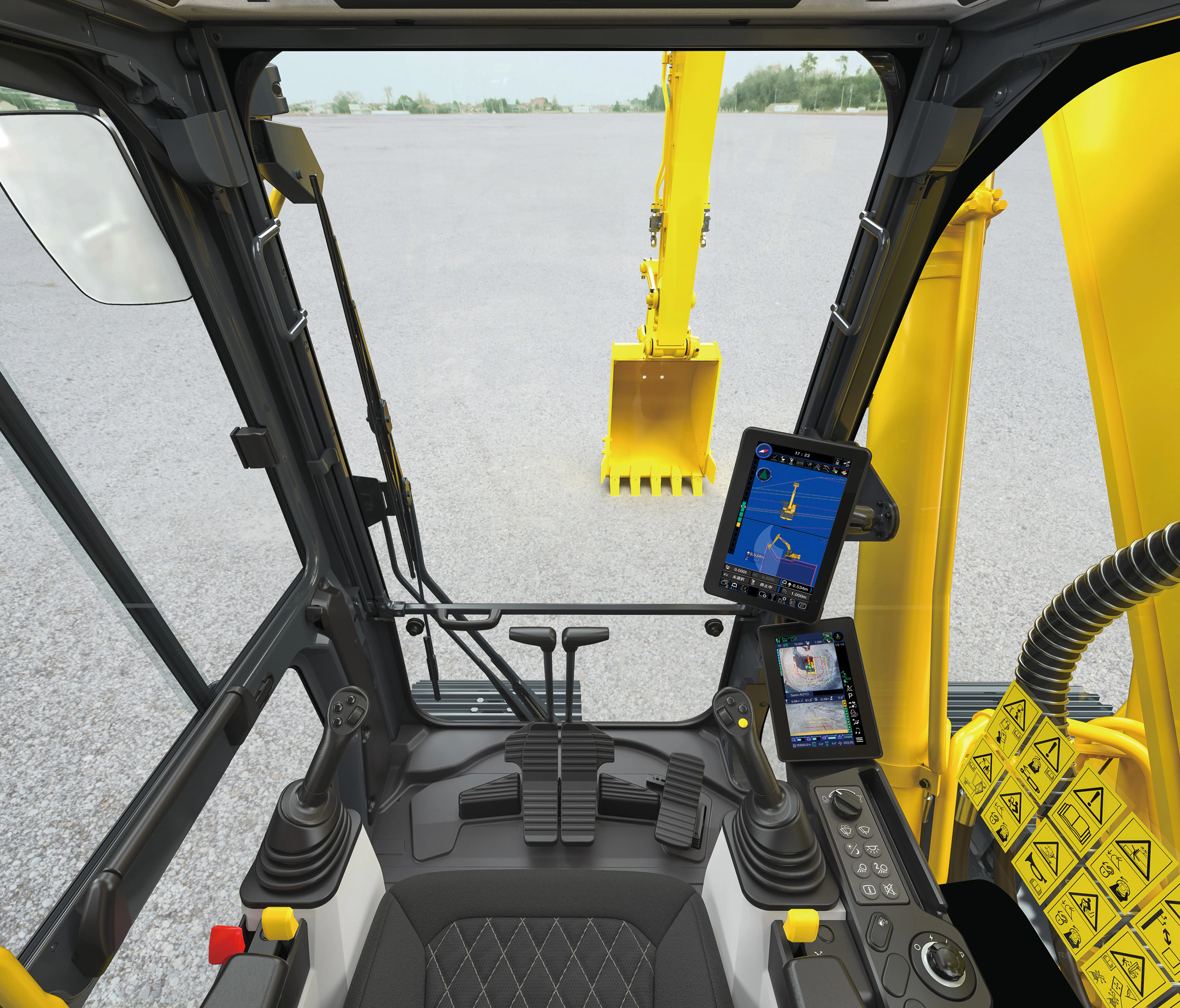 Utöver den intuitiva körkänslan erbjuder den nya hytten komfort i världsklass. En 30 % större hytt med rejält ökat benutrymme och ett helt nytt premium-säte gör långa arbetspass mer behagliga. 50 % förbättrad sikt på nedre högersida, luftutsläpp i taket, joystick-styrning som standard och smart förvaring skapar en arbetsmiljö där det är lätt att trivas.