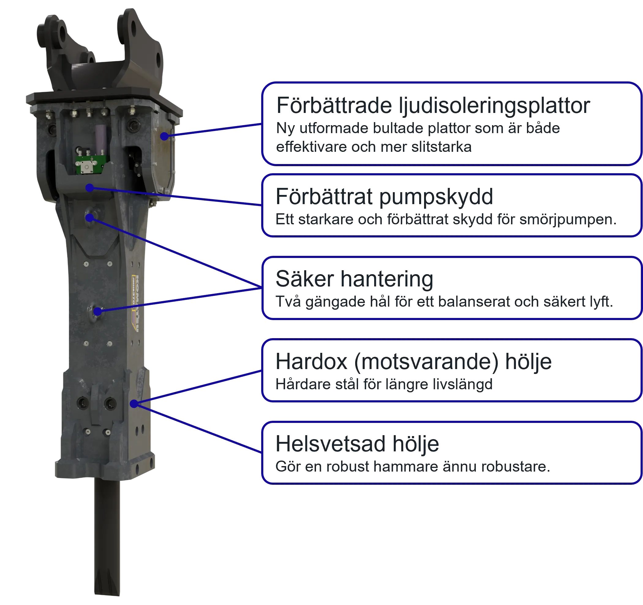 Samtliga modeller i H- och V-serien har fått ett nytt hölje tillverkat av slitstarkt Hardox-material. Denna uppgradering gör hammaren mer robust och förlänger dess livslängd. Dessutom är designen säkrare och enklare att hantera. Vissa modeller har även fått en cylinderhylsa, som sänker total ägandekostnad (TCO) genom att göra det enklare att byta ut slitna delar.
