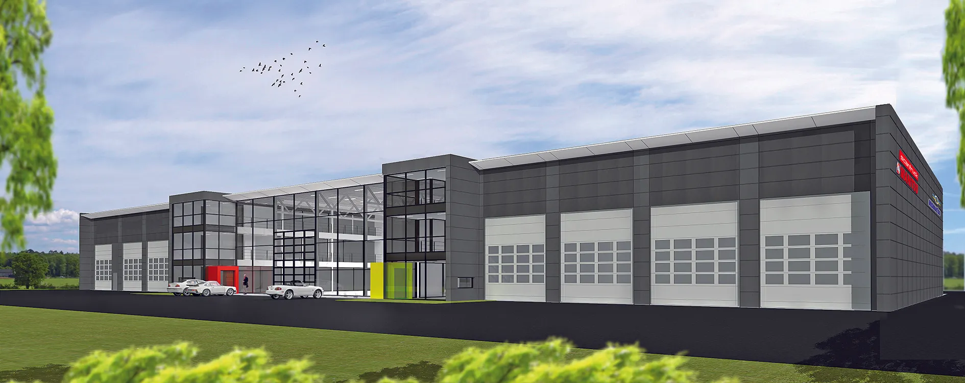 3,000 kvm ny byggnad blir ramen runt maskinmärkena Manitou och Mustang från Scantruck och Komatsu från Söderberg & Haak. Bandet till nybygget klipps fredag 4 maj.